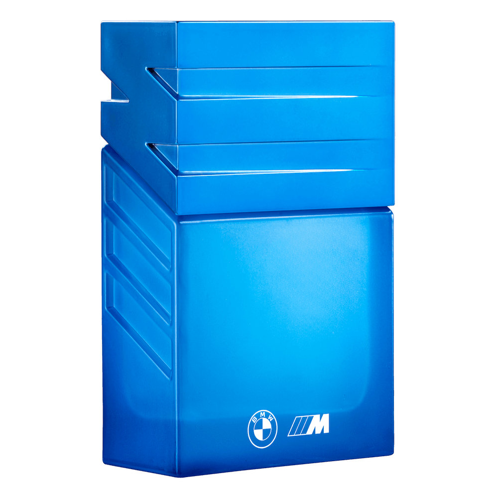 Флакон выполнен в ярко-голубом цвете, символизирующем первую полосу логотипа M.